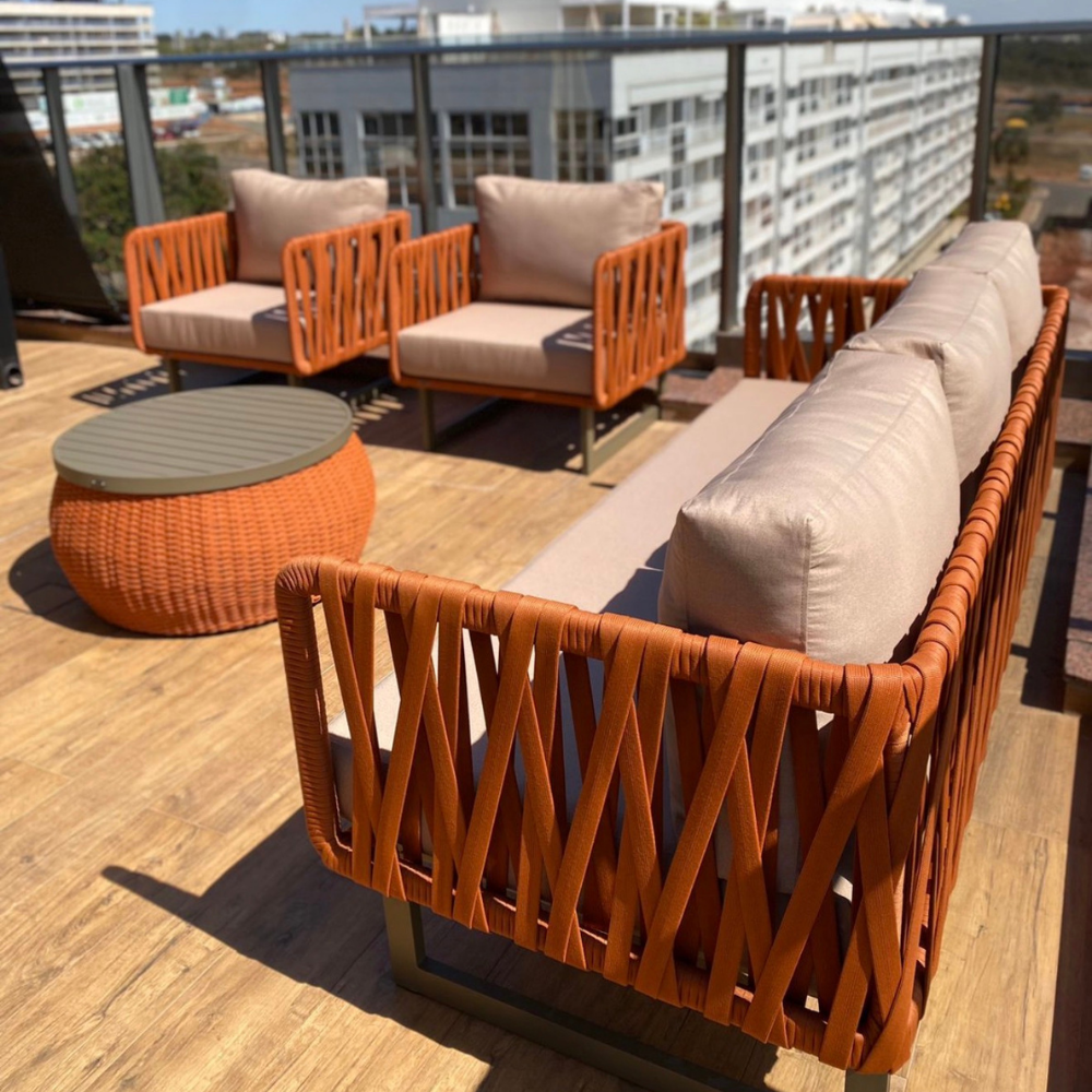 Jogo de sofá em fita tricô, com base em alumínio, e mesa de centro em corda náutica, com tampo em alumínio.