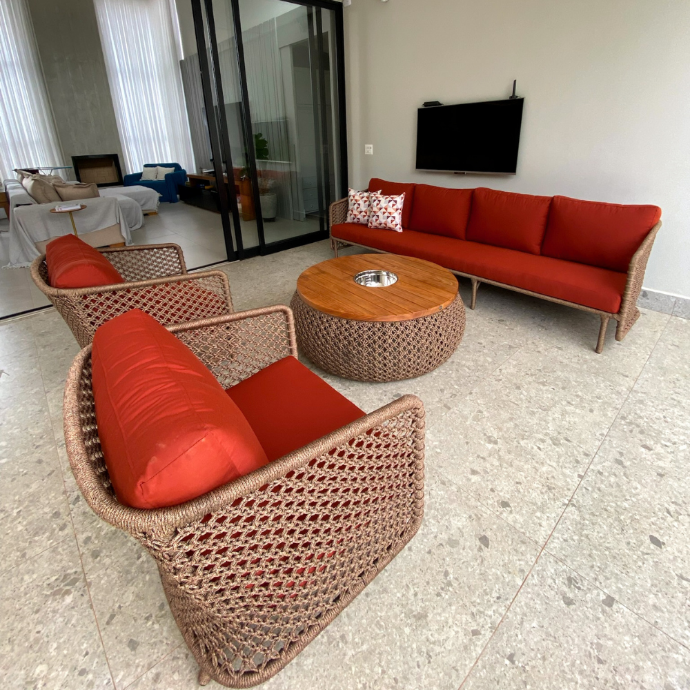 Feito em corda náutica com trama em macramê e mesa de centro em corda náutica, com tampo em madeira.
