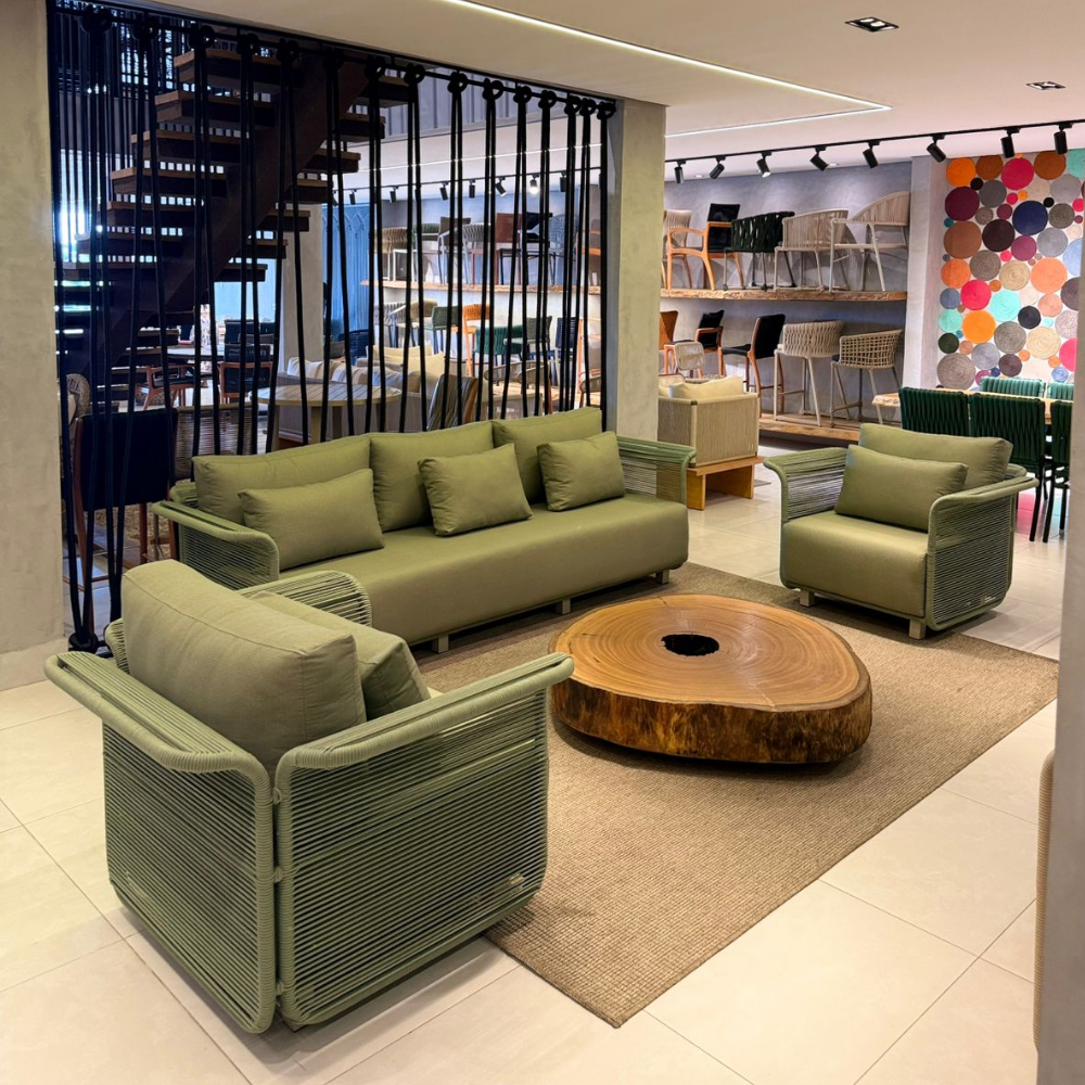 Em corda náutica, com estrutura em alumínio e tecido impermeável, e mesa de centro rústica