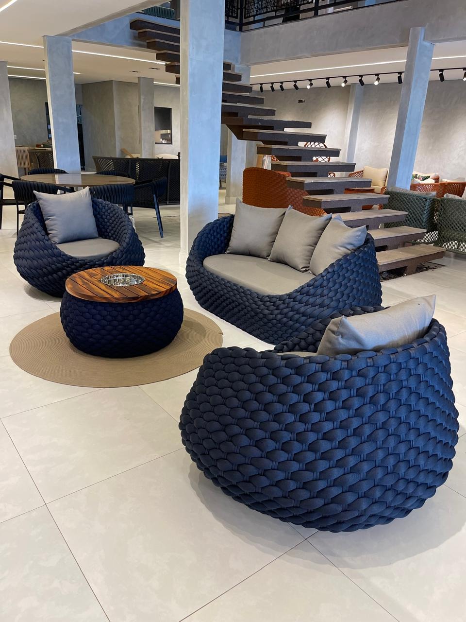 Feito em tricô náutico, com base em alumínio, e mesa de centro em tricô náutico, com tampo em madeira.