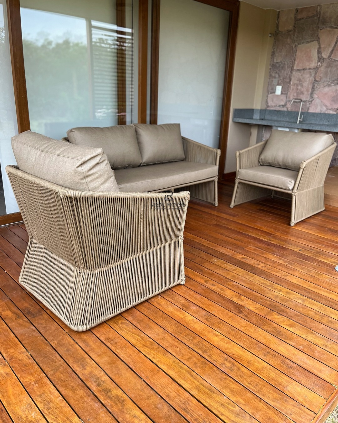 Em corda náutica e  com estrutura em alumínio.