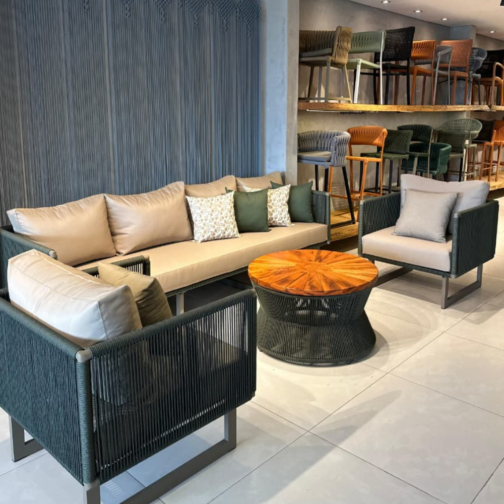 Em corda náutica, com estrutura em alumínio e tecido impermeável, e mesa de centro em corda náutica com tampo em madeira.