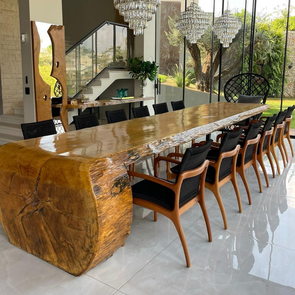 Mesa cascata em madeira péquia com cadeira Tópazio, feita em corda náutica e estrutura em madeira.