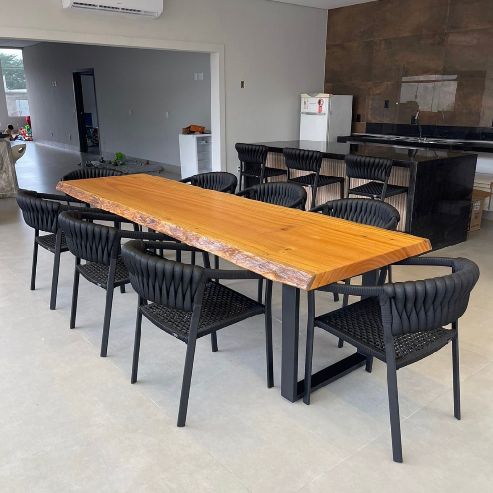 Mesa em madeira péquia e cadeira em tricô náutico, com estrutura em alumínio