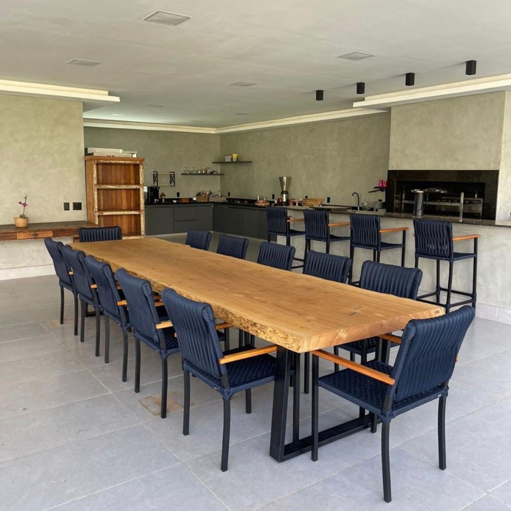Mesa rústica em madeira péquia e cadeira em tricô náutico, com braços em madeira e estrutura em alumínio.